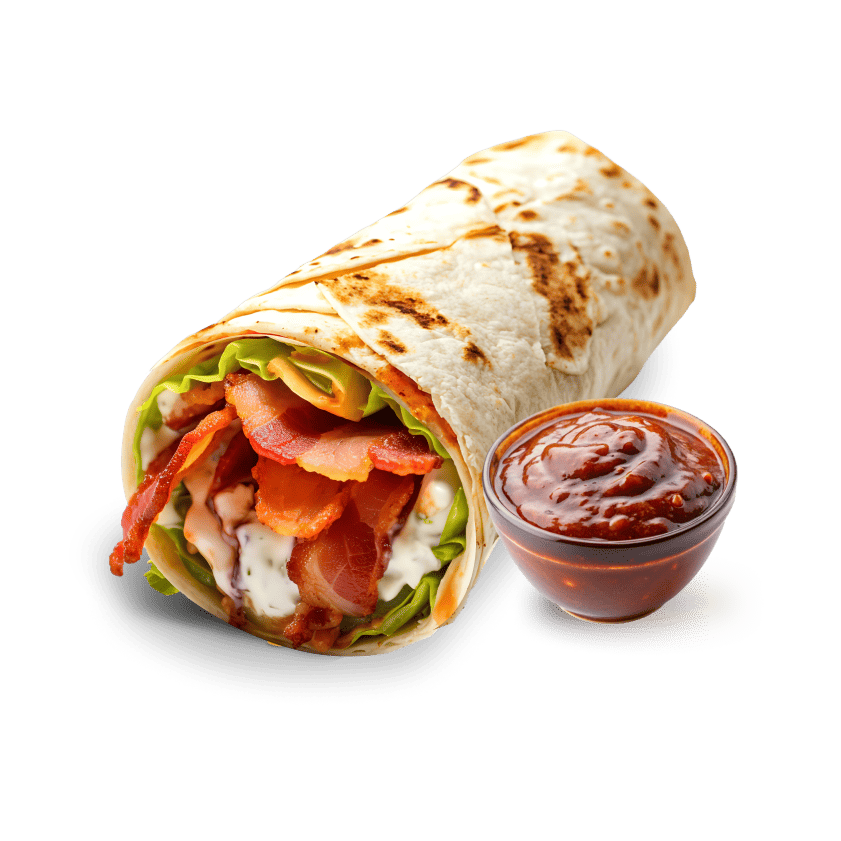 Лаваш, Капуста, Томат, Мясо птицы, Чесночный соус, Барбекю соус, Бекон, Свежий огурец