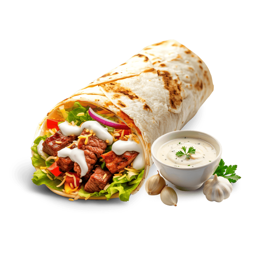 Лаваш, Капуста, Томат, Мясо птицы, Чесночный соус, Маринованный огурец