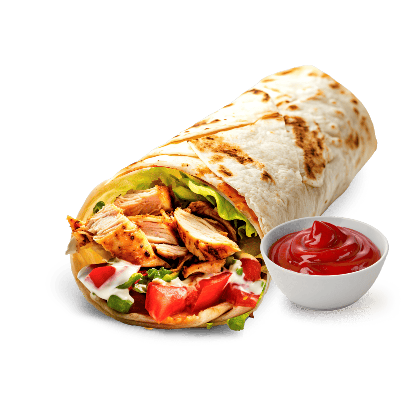 Лаваш, Капуста, Томат, Мясо птицы, Чесночный соус, Маринованный огурец, Фирменный соус